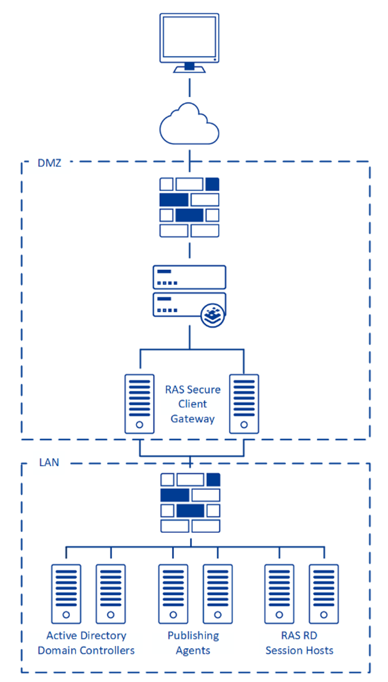 En la siguiente Figura 3 muestra un escenario en el que el RAS Secure Gateways HTML5 Portal se implementan en la DMZ. El servicio de RAS Secure Gateway reenviará las peticiones vía HTTP a un host de sesión de escritorio remoto, RAS RD, que tendrá instalada la función de Servicios de Escritorio Remoto (RDS).